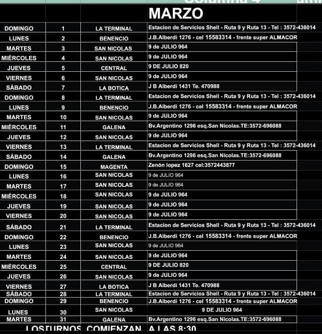 LOS TURNOS COMIENZAN A LAS 8.30 HS. Y FINALIZAN A LAS 8.30 HS. DEL DIA SIGUIENTE, CUALQUIER CAMBIO DE TURNO NO CONFIRMADO AL MOMENTO DE ESTA IMPRESIÓN, SERA COLOCADO EN EL TURNERO DE CADA FARMACIA CON EL DÍA CORRESPONDIENTE