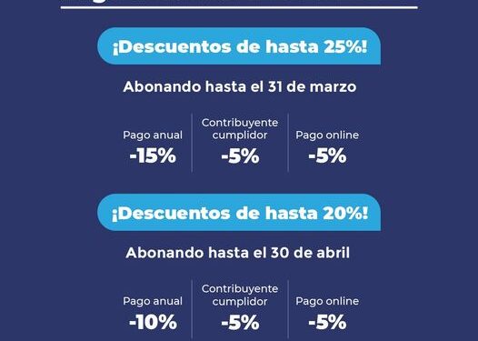 Descuentos a las tasa Municipales, puede acceder hasta un 25% de descuentos, optando un pago anual en este 2022 hasta el 31 de Marzo del corriente año. Podes pagar con un 15% menos, por pago anual más 5% Contribuyente Cumplidor, más 5% pago OnLine a través de la página.